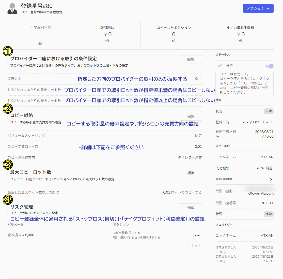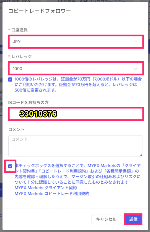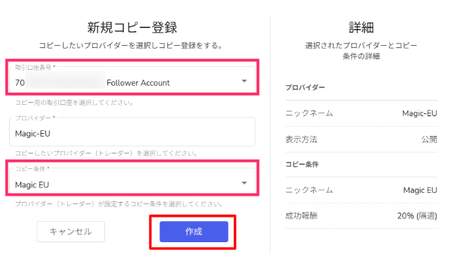 - 取引口座番号:コピーするフォロワー口座番号を選択