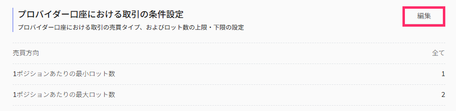 詳細設定①:プロバイダー口座における取引の条件設定