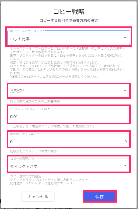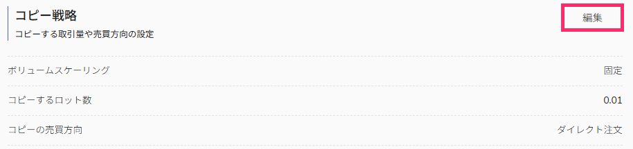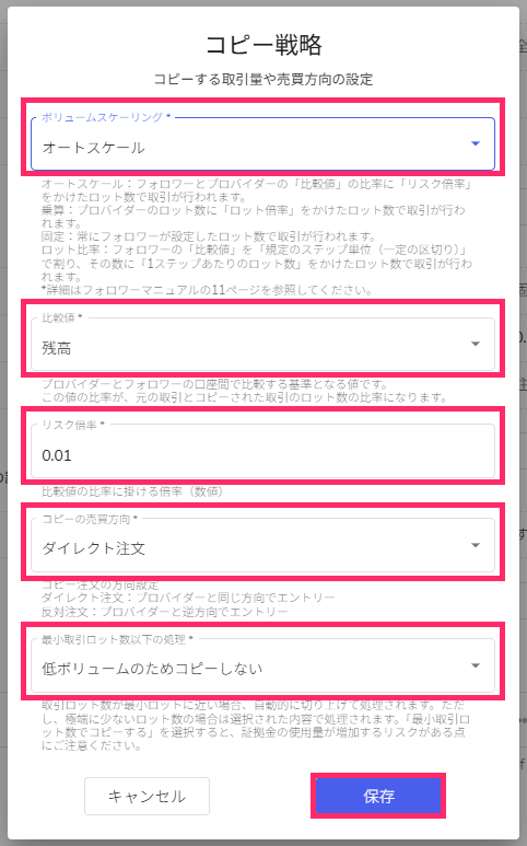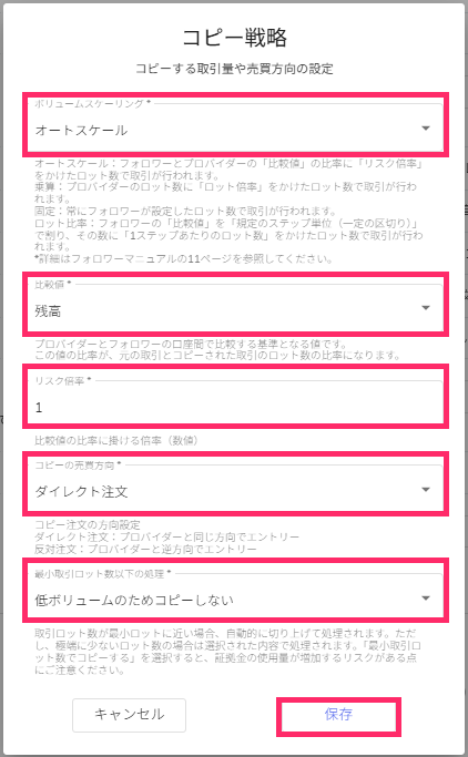 - 最小取引ロット数以下の処理:「低ボリュームのためコピーしない」「最小取引ロット数でコピーする」のいずれかを選択