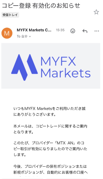 コピートレードが有効になると、登録メールアドレス宛に【コピー登録 有効化のお知らせ】のメール通知が届きます。