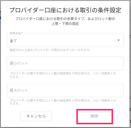 - 売買方向:「買いのみ/プロバイダー口座の買いポジションのみがコピーされる」「売りのみ/プロバイダー口座の売りポジションのみが反映される」