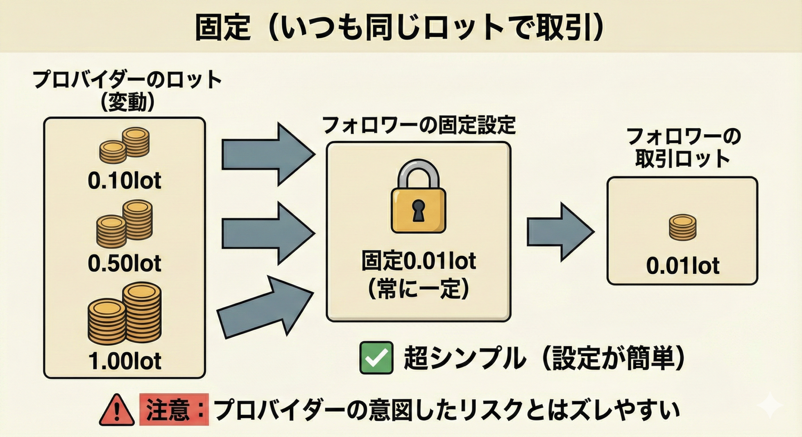 - 最小ロット:プロバイダー口座での取引ロット数が設定値を下回るポジションはコピーされない