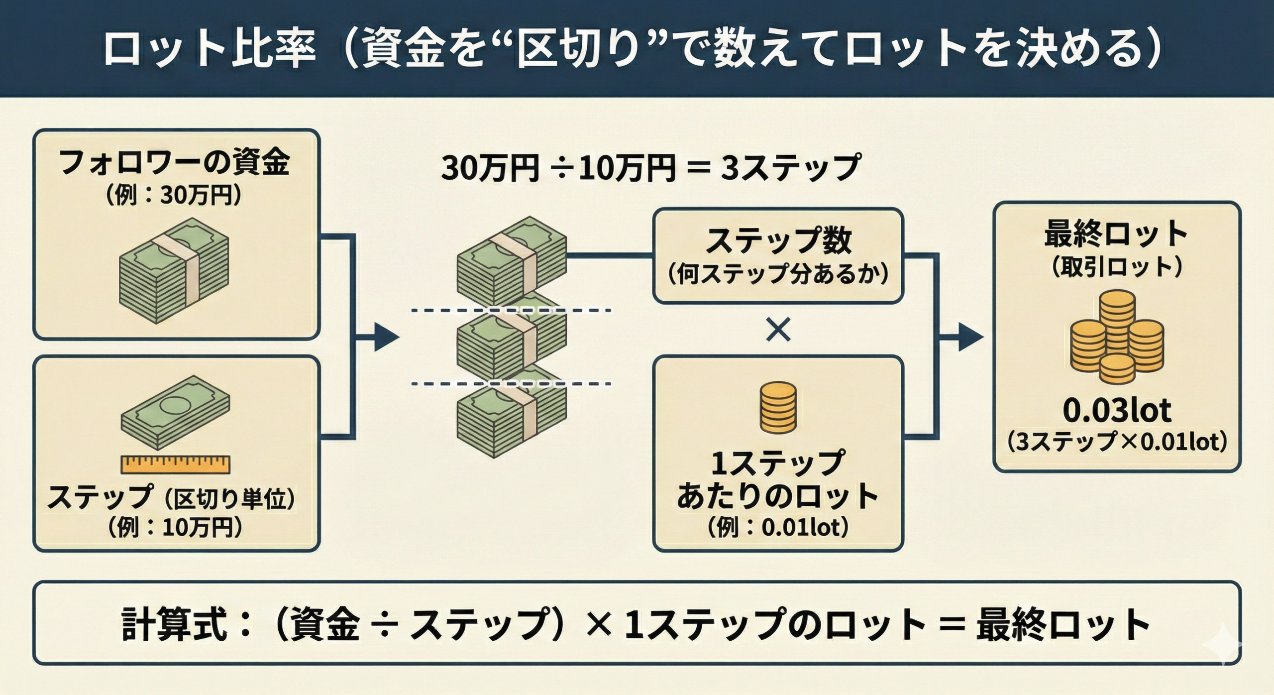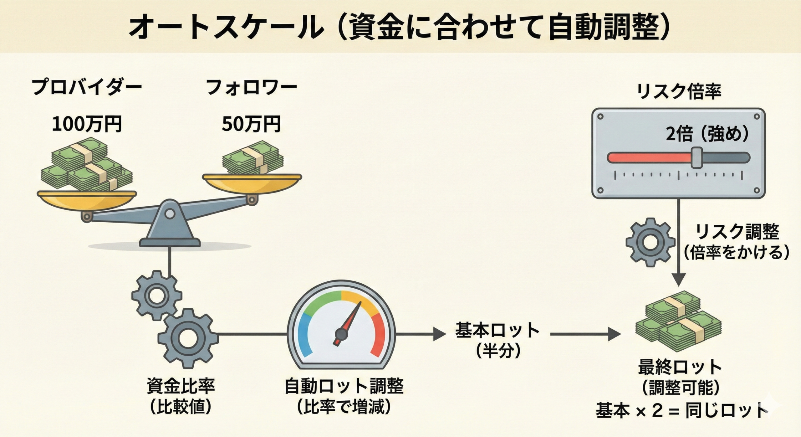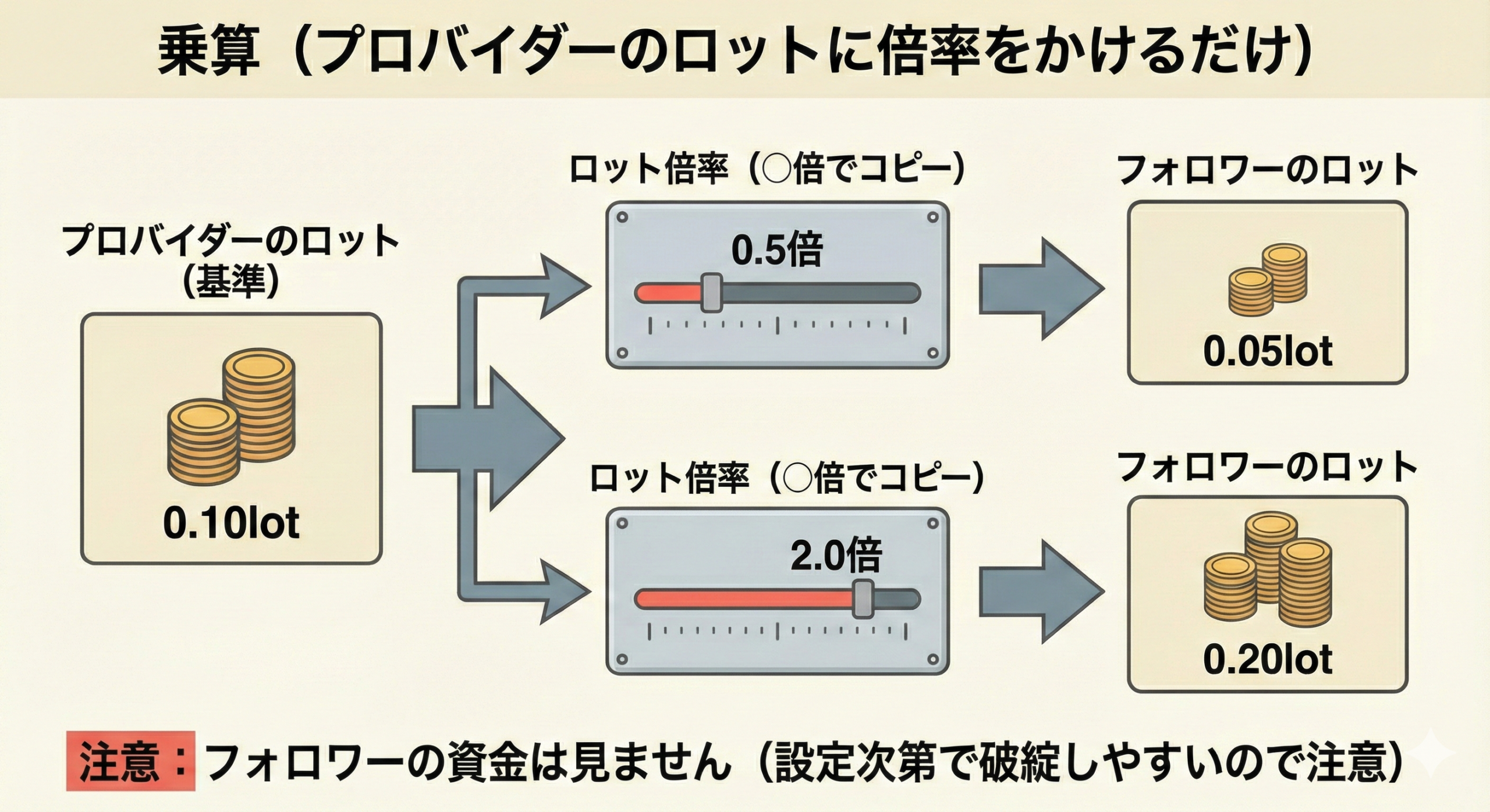 フォロワー口座とプロバイダー口座の「比較値」の比率に「リスク倍率」をかけたロット数で取引がコピーされる