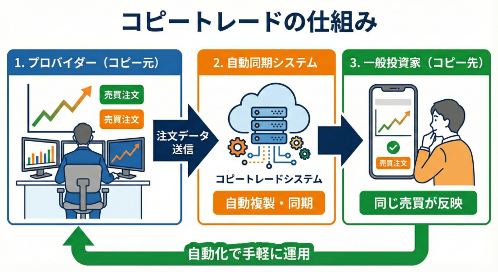 コピートレードとは、実績のあるトレーダーの取引を自動的に自分の取引口座へ反映させる仕組みのことです。